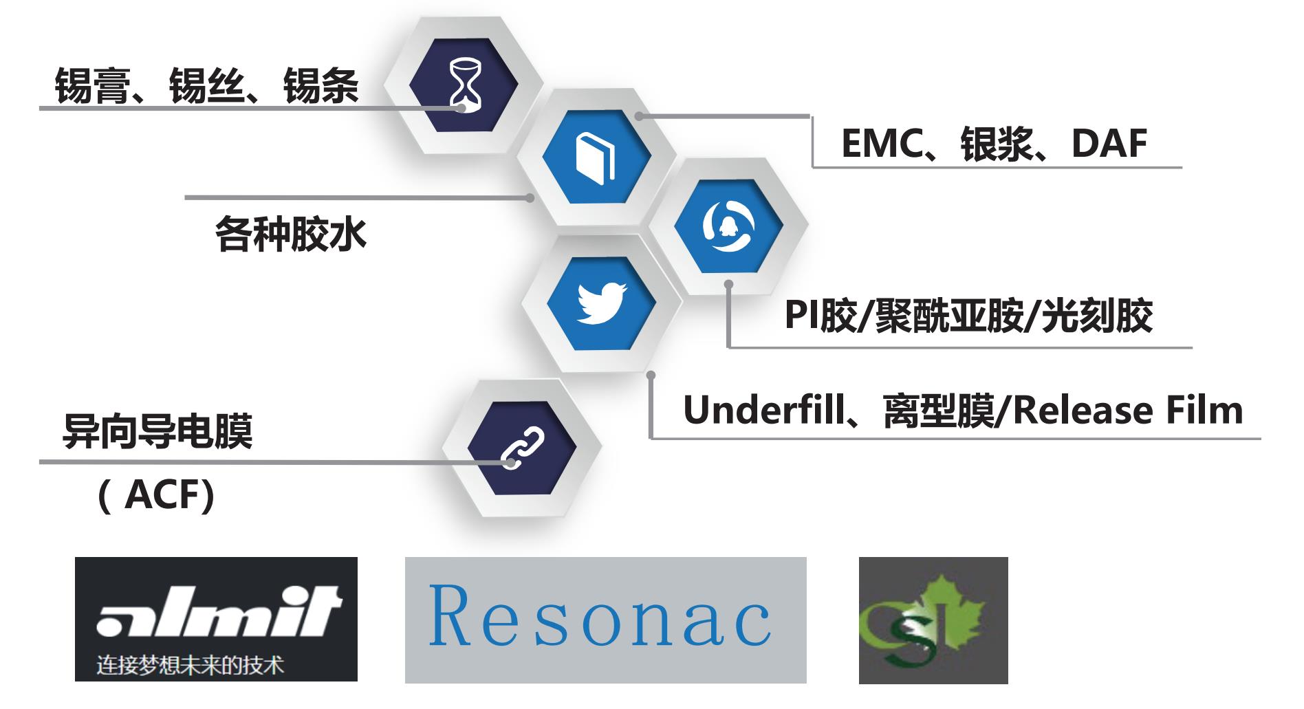 1、半导体封装材料(PI胶/光刻胶/聚酰亚胺、DAF膜、EMC/环氧塑封料、DAF膜、银浆/银胶、Underfill/底部填充胶、PI胶·光刻胶·聚酰亚胺、等)